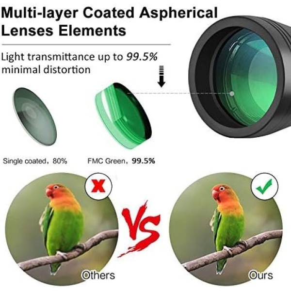 [Professional Powerful Binoculars]- Multilayer-coated aspherical lenses elements provide superior light transmission and minimal distortion, better image brightness, contrast and quality. The Bak-4 prism has a perfectly round exit pupil. Providing bright, clear and razor-sharp viewing.