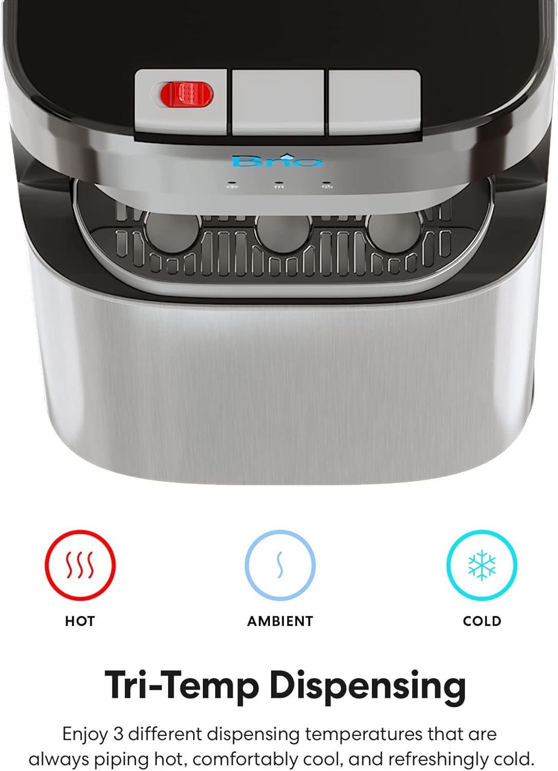 HOT, COLD & ROOM-TEMPERATURE WATER: Three temperature settings allow you to customize your drinking experience. The Brio Essential hot and cold water dispenser features hot, cold, and room-temperature functions for either refreshing and satisfying hydration or a soothing hot beverage.